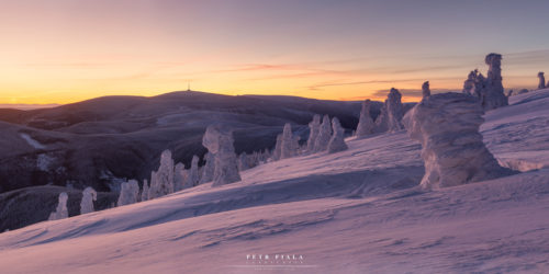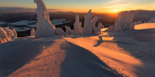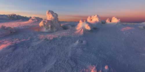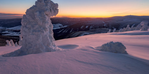 Jedno zimní ráno na horách. Struktura navátého sněhu může připomínat cokoliv, jako tato hřbet draka, pořízená na Červené hoře.