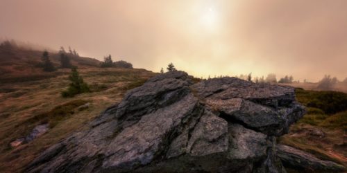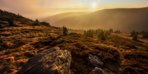 Hodně zajímavá světelná atmosféra se vytvořila na Červené hoře. A to díky přicházejícím mrakům a slunci, jehož paprsky prostupovaly skrz ně. Pohled na Vřesovou studánku (dole uprostřed) a vrchol Vozka (vpravo nahoře).