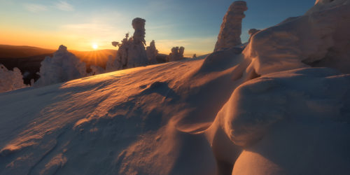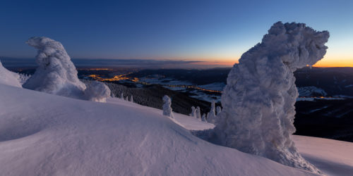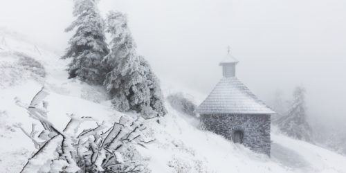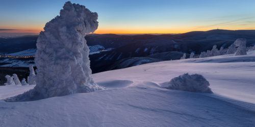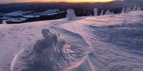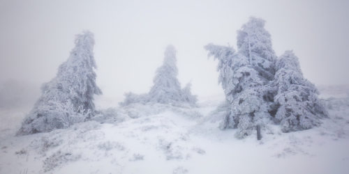 Za tmy ranní výstup na Červenou horu s očekáváním slunečného východu. Východ slunce se nekonal podle představ a tak po promrzlé hodince na hřebeni jsme se s parťáky Honzou a Tomášem vydali na Vřesovou studánku. Počasí bylo dost nevlídné…silný vítr, mráz a sněžení. Vše se zahalilo do sněhového kabátu a i přes takové podmínky, měla krajina něco do sebe. Fotografie je v barvě, ale vzhledem k atmosféře působí jako černobílá.