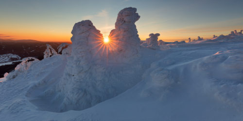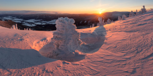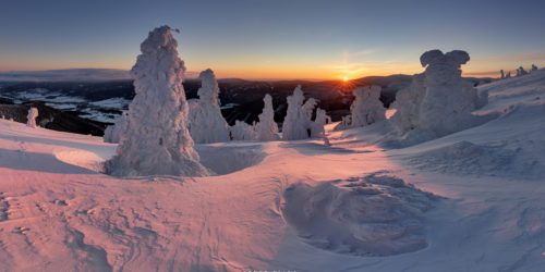 Těsně před východem na Červené hoře v Jeseníkách. Pěkně mrazivo -15, zima jak má být. Vpravo v dáli je vidět Praděd – nejvyšší hora na Moravě.
